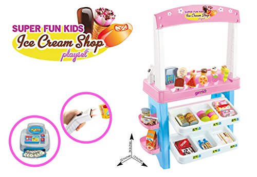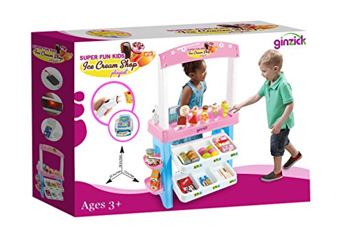 - Feature : Ginzick Super Fun Kids Ice Cream Shop Playset / A kid-sized Children Ice Cream Shop Playset this set has everything a child needs to play Ice Cream Shop Entertains children while teaching useful skills / High Quality, Durable design makes a great addition to any play area Choose from the many different ice cream flavors and pops / All included Ready to Play 47 play pieces Ice Cream Shop, Pretend Toy Cash Register, Food and Play Money, Various ice cream flavors and pops etc, and Working Scanner with Light and Sound Product Size: 24" x 15" x 31.5", Scanner Requires 2 AA Batteries (not included)