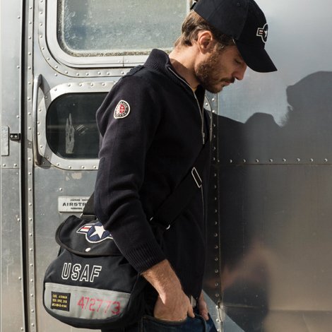 -. Feature : Navy USAF Shoulder Bag in 100% cotton twill. / Twill tape binding and adjustable cotton webbing strap / Dimensions: 14 " wide x 14″ high