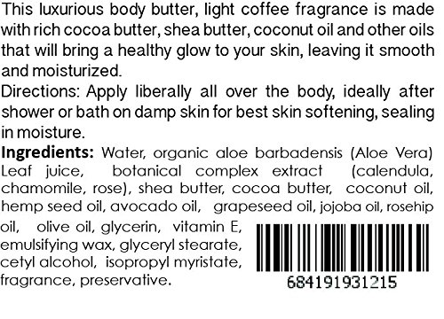 All natural ingredients. Our body butter is exclusively formulated with the perfect blend of Shea Butter, Coconut Oil, Hemp Seed Oil, Jojoba Oil, Vitamin E and natural and organic oils. This non-greasy formula leaves skin ultra hydrated and silky smooth.