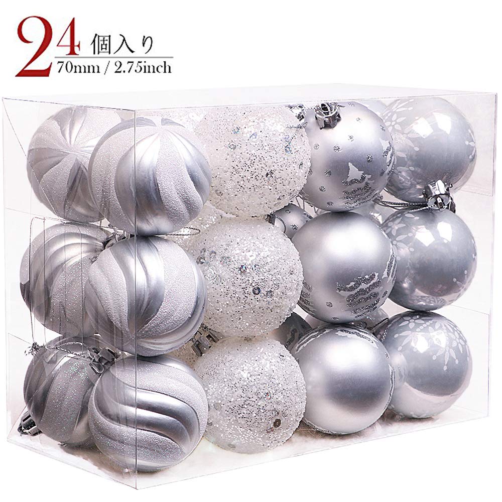 シックなデザインと繊細で芸術的なハンドクラフトの技術でできたオーナメントボールは、お客様に、オリジナルが目を引く楽しいクリスマス空間を作り出します。 おしゃれなシルバーとホワイトをベースしたボールは、ロマンティックなクリスマスを演出します。ホワイト或いはピンクツリーにイルミネーションと飾ると、幻想的なムードを生み出します。 色を引き立てる銀色は鮮やかな色と併せて使うと雅びやかになりますので、当店での銀&ピンクシリーズと赤&緑&白&銀シリーズのオーナメントを勧めます。 クリスマスツリーを飾りつけるだけではなく、オリジナルのボール型のビーズガーランド、テーブルセッティングを引き立てる小物としても素敵です。 ツリーに吊るために糸がついております。とても便利につるすことができる、子供でも使えます。包装も頑丈なデザインを工夫しましたので、ご安心ください。過程~楽しい:飾り付けはアレンジ次第でバリエーションは無限大!セット内容が豊富なので、準備は少し大変かも知れませんが、主役の方の喜ぶ顔を想いながら、準備する過程も楽しんで頂けたら嬉しいです