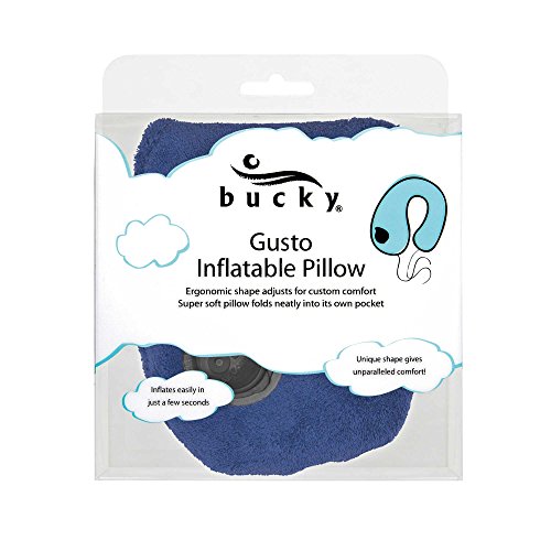 -. Binding : Apparel -. Brand : Bucky -. Department : unisex-adult -. Feature : Too soft or too hard? Add air with as little as 1 breath or release with the touch of a button / Head drooping forward? Tighten the snap toggle and swivel the inflatable pillow until it fits just right / Head leaning to the side? Swivel the inflatable pillow around your neck until you find that perfect spot / Folds neatly into its own pocket for travel convenience and easy storage / Patented On-Air valve inflates and deflates in seconds -. Label : Bucky -. Manufacturer : Bucky -. Model : T400 -. ProductGroup : Apparel -. ProductTypeName : LAGE -. Publisher : Bucky -. Studio : Bucky -. Title : Bucky Gusto Inflatable Travel Pillow