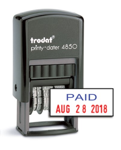-. Binding : Office Product -. Brand : Rubber Stamp Creation -. Feature : Date Size: 5/32" (a bit more than 1/8") / Date Range: Good through 2025 (12 years) / Good for a few thousand impressions before need to re-ink / Ink Color: Blue/Red / Ships same day or next business day from order -. Label : Trodat -. Manufacturer : Trodat -. MPN : 4850paidbr -. PackageQuantity : 1 -. PartNumber : 4850paidbr -. ProductGroup : Office Product -. ProductTypeName : OFFICE_PRODUCTS -. Publisher : Trodat -. Studio : Trodat -. Title : Trodat 4850 Date Stamp with "PAID", 2-Color Self Inking Stamp - Blue/Red Ink