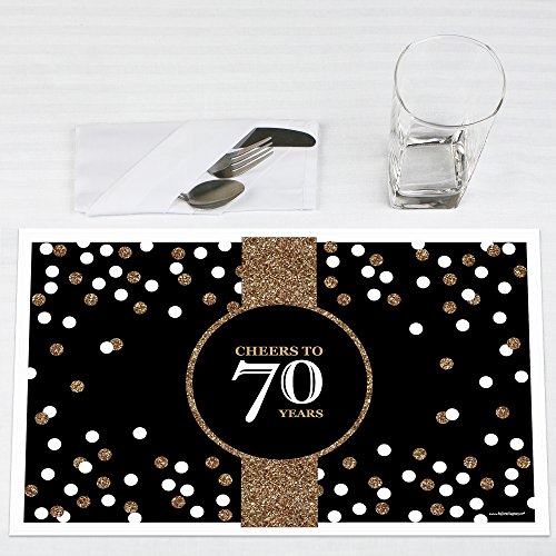 -. Feature : Adult 70th Birthday - Gold - Birthday Party Placemats - Set of 12. Each 70th birthday placemat is 12" inches x 18.5" inches. / Perfect inexpensive table decorations to wow all your guests. **Please note the glitter is faux...which means it is P.R.Inted to look like glitter, it is not real glitter / Placemats are meant for one-time use and are disposable. / P.R.Inted on light weight and smooth paper. / During shipping they are rolled to protect the placemats. To flatten them for your table décor - simply reverse roll.