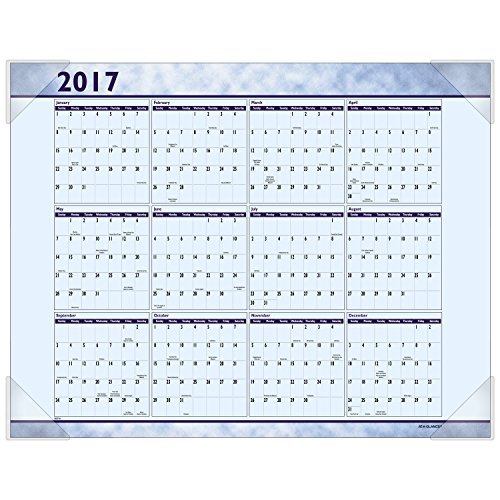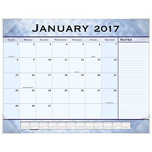 -. Feature : Stylish desk pad helps protect your desk and features upscale slate blue design on each page. Covers 12 months January - December for monthly planning all year long. Julian dates / Displays one month at a time with full year reference calendar. Notes space on every page to keep you organized while planning ahead / P.R.Inted on quality paper containing 30% post-consumer recycled material. Page size 21-5/8 x 16-7/8 inches. Overall size 22 x 17 inches. / Unruled, daily 2 7/16 in. x 2.25 in. blocks allow you to jot down notes freely. Bonus pages are included: current and future yearly reference calendars and dates to remember page to assist in your planning and organization endeavors / Tuck pages into the four, clear poly corners to keep them flat. Durable backboard for a sturdy writing surface