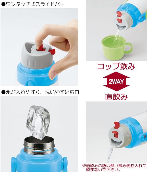 直接口を付けて飲む水筒としても、コップに入れて飲む水筒としても使える2WAYのステンレスボトルです。氷を入れやすい広口タイプで、ワンタッチ式のスライドバーで飲み方をお選びいただけます。 |