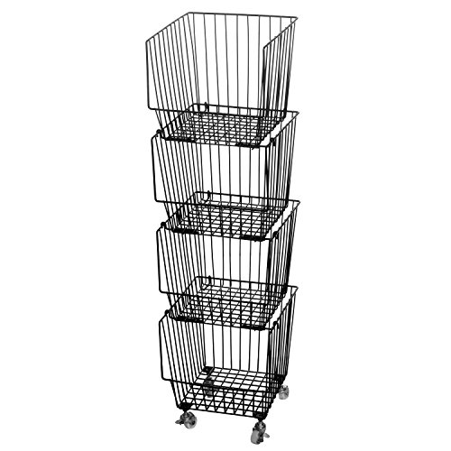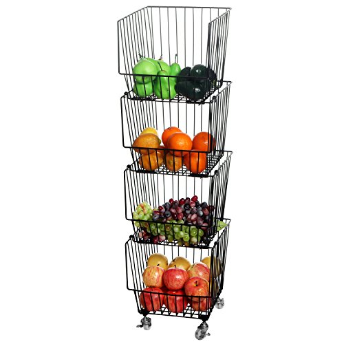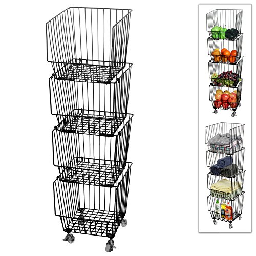 Set of 4 Stackable Rolling Black Metal Wire Produce Storage Rack / Kitchen Pantry Organizer Bin w/ Wheels