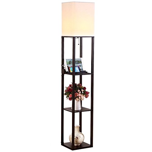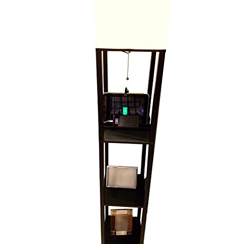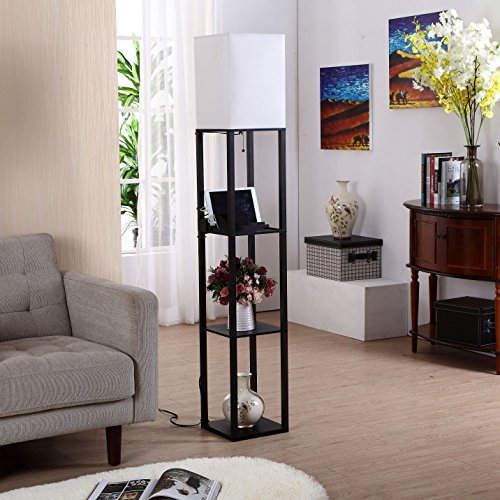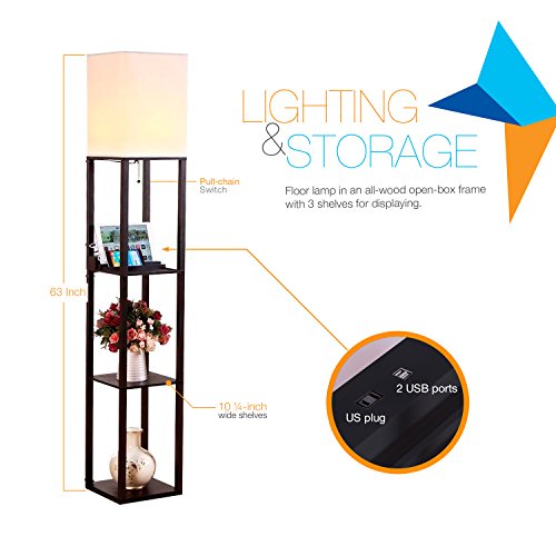 - LIGHTING & STORAGE: 63-inch tall floor lamp in an all-wood open-box frame has 3 flat-surface 10 ¼-inch wide shelves for displaying ceramics, decorative glass, family photos, flameless candles, magazines, and more. (Note: bulb is not included.)