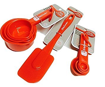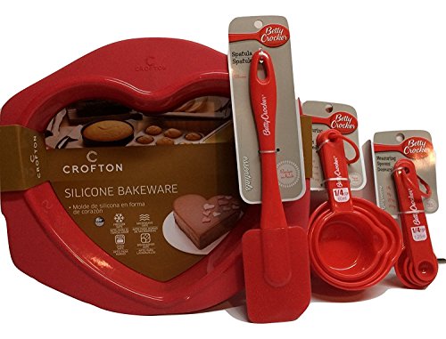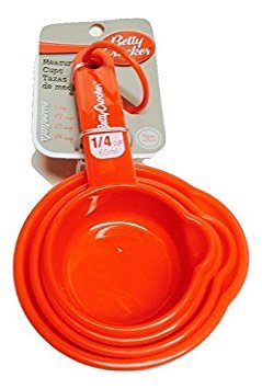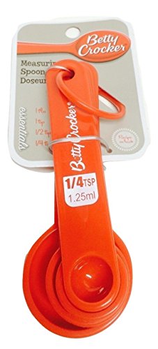 - Recipes included: Fiesta Fudge Cookies! Easy Monster Cookies! Cranberry-Poppy Seed Muffins! Go to BettyCrocker.com for complete baking instructions. Betty Crocker beautiful red baking accessories are dishwasher safe and include 4 convenient sizes of Measuring Cups (1/4, 1/3, 1/2, 1 cup), Measuring Spoons (one tbs, one tsp, one 1/2 tsp, one 1/4 tsp) and one non-porous silicone spatula.
