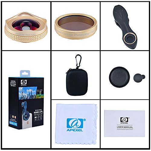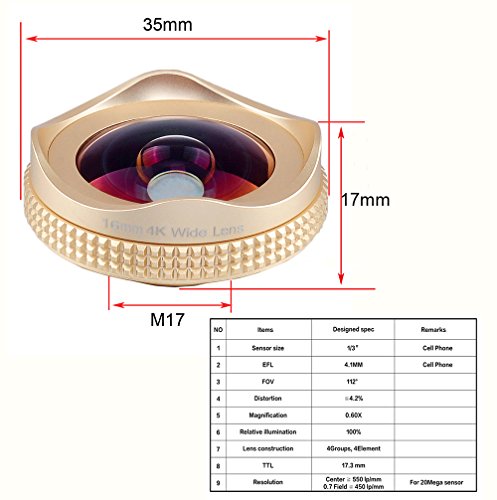 Feature: Polarizers filter lens can greatly enhance outdoor images by increasing contrast and color saturation,eliminating reflections from glass and other non-metallic surfaces,and darkening blue sky. A polarizer has two rings.The bottom ring screws on to the front thread of a lens,and the top ring is rotatable. As the top ring rotates,one can see the effect through the phone screen. Wide lens will extend your pictures edges on all sides to get you the perfect shot of an overall view. It is useful in architectural,cityscape, interior and landscape photography.You can also enjoy taking selfies,portraits,large group photos,concerts,football match,road trips,hiking, vacations,panoramas and vistas. Specification: Sensor size:1/3” EFL:4.1MM FOV:112 Distortion:?4.2% Magnification:0.6X Relative illumination:100% Lens construction:4Groups, 4Element TTL:17.3 mm Resolution:Center ? 550 lp/mm 0.7 Field ? 450 lp/mm Box contain: 1 x 16mm wide angle lens 1 x CPL Len 2 x Lens Cap 1 x Universal clip 1 x Cloth bag 1 x User manual