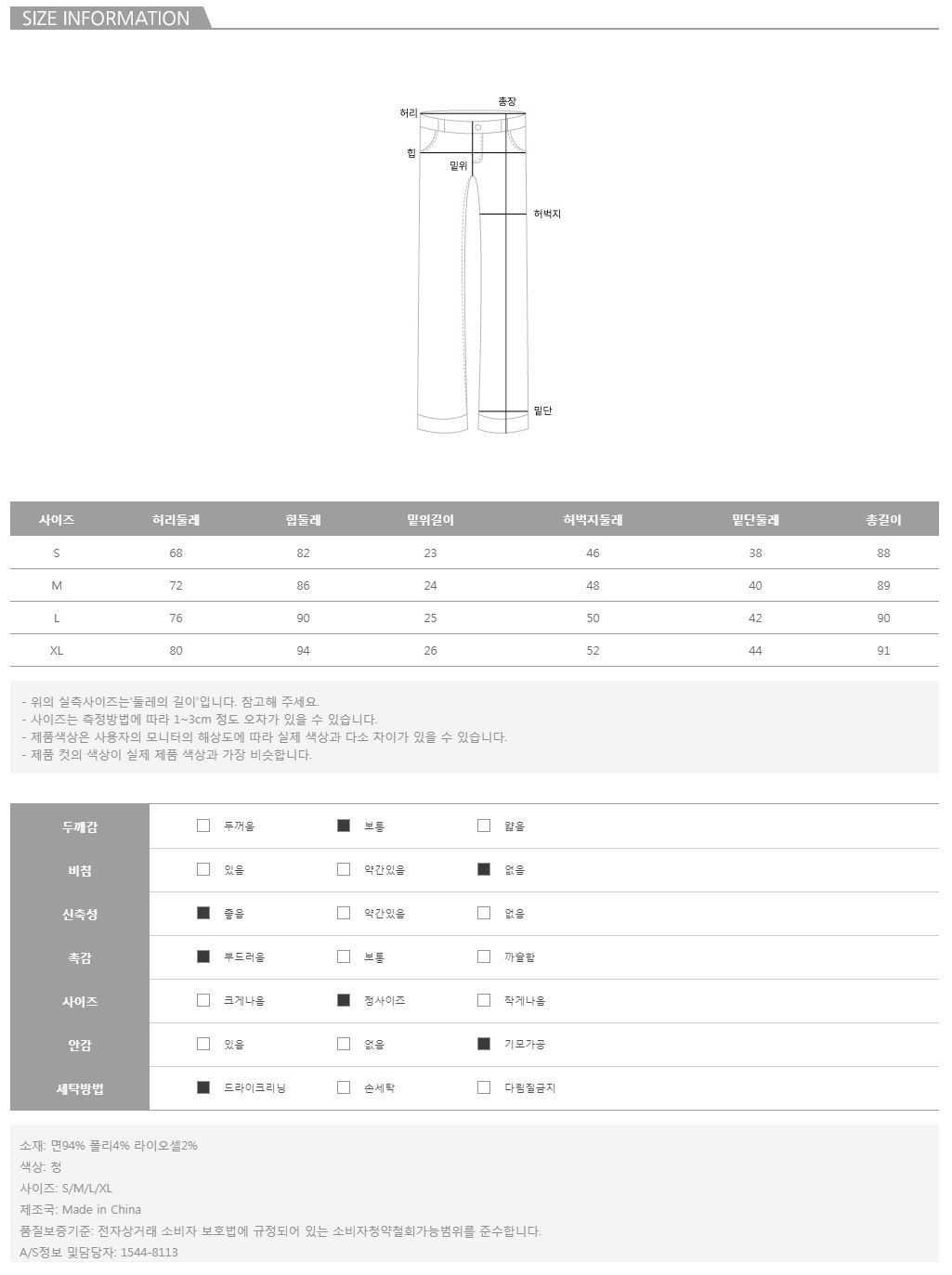 모델의 착용 컬러/사이즈는 청/S 입니다.
