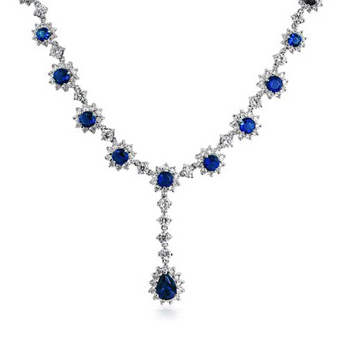 Add an element of royal flare to with our CZ Flower Crown Set Necklace. A stunning deep blue CZ Simulated Sapphire teardrop is bordered by CZ jewelry stones. The necklace pendant hangs from a necklace that is made up of dazzling cz flowers with colorless cz accents that resemble beautiful jewelry. This Simulated Sapphire necklace is rhodium plated for a shining white Gold Plated look and has a box and safety clasp. Wear it as bridal jewelry to add your something blue on your wedding day. Or give it as a present to your favorite September baby as a piece of birthstone jewelry.Feature