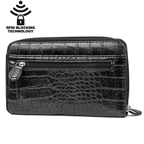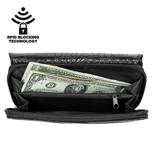 RFID BLOCKING TECHNOLOGY: Each wallet is manufactured with RFID blocking technology. Now you don't need to worry about thief's steeling your credit cards, debit cards or driver's license information. Wireless identity theft, also known as contactless identity theft or RFID identity theft is a growing concern as more cards are enabled with RF-enabled technology. Protect yourself from these thieves with our RFID Blocking Wallet. Our RFID Blocking clutch will secure your Identity and personal information from RFID scanning devices, skimming devices and electric pickpockets.