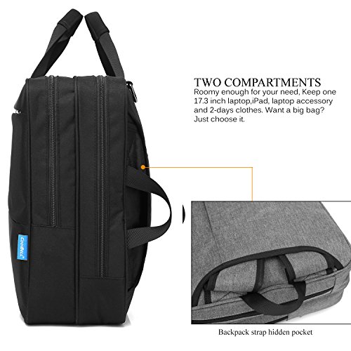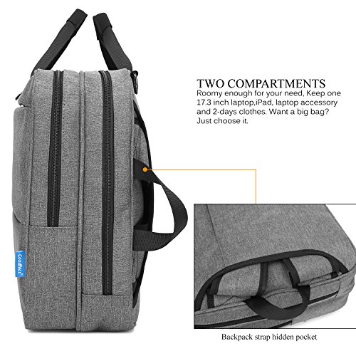 Studio : CoolBELL Publisher : CoolBELL Binding : Office Product Product Description CoolBELL Sbases on the cutting-edge of fashion trends. Pursuing the best quality of laptop bag category and devoting to providing the best product and service to customers. We make every effort to achieve the best in every detail of design,color, material, sewing, sales and service. Fits laptop brand like Dell / HP / Toshiba / Lenovo / Acer / Macbook air/ macbook pro/ iPad / iPad pro which ups to 17.3 inches.Suits for College students, businessmen, office staff, teens, students, outdoor gens etc. Brand: CoolBELL Description: Multi-functional Bag Size: 18.8 x 5.1 x 13.7 inches; Fits up to 17.3 inches laptop. Weight: 1.3 kg Color: Black Grey Material: Oxford Nylon cloth; 210D waterproof polyester lining Three carrying styles: Backpack style:Comfortable back strap system, easy and convenient to load on your back. Shoulder bag style: One back pocket for hiding the back straps, A removable Shoulder strap been include, when you use it as a shoulder bag. Messenger bag style: One back pocket for hiding the back straps when you use it as a messenger bag. Feature: This bag can convert to backpack, shoulder bag and briefcase,just you want it to be. So convenient for carrying. Construction: Two main compartments designed for keeping laptop or tablet etc. Accessory compartment with pockets inside for keeping items like power cord, mouse, keys, passport , phones etc. Three Front pocket with zipper design. It is convenient for carrying pens, power bank, phones etc.Safe for your items. A durable luggage belt is convenient for fixing the bag on the trolley of a luggage case.? Style: Simple Steady Water Resistance 0