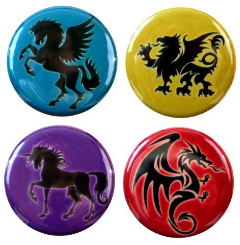 Product Description Mythical creatures four button set, with a pegasus, gryphon, unicorn, and dragon. Each button is 1.25" in diameter. Made in the USA 0