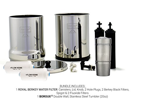 BOROUX BERKEY FILTER BUNDLE INCLUDES 1 Royal Berkey System 3 GALLON CAPACITY (stainless steel water filter) with 2 Black Berkey Purification Elements (Powerful Water Filters) and two Fluoride Filters Bundled with 1 BOROUX 20 oz Stainless Steel Double Wall insulated Tumbler cup. All parts and pieces are BPA free. ROYAL BERKEY IS THE 2ND MOST POPULAR BERKEY WATER FILTER SYSTEM AS IT IS IDEAL FOR FAMILIES 5+ people