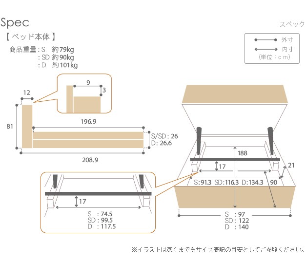 ●サイズ(cm):幅97x奥行208.9x高さ81(床板高さ26)cm・約79kg