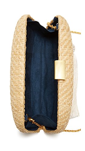 This hardshell Kayu clutch is covered with woven straw. Magnetic top. Suede-lined interior. Hideaway chain shoulder strap with decorative tassel. Dust bag included.