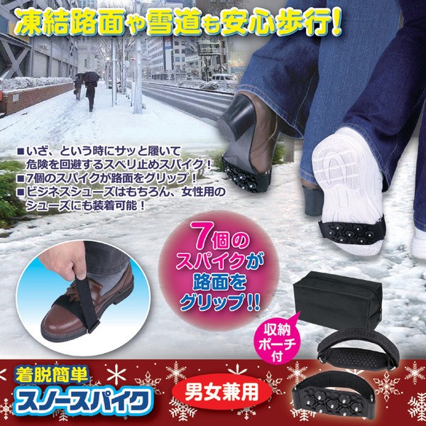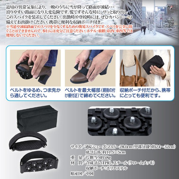 近頃の異常気象により、一晩のうちに雪が降って路面が凍結!滑りやすい路面になり大変危険です。慌てずそんな時に、サッと取り出しこのスパイクを装着してください。出勤時や登校時には、ぜひカバンに一つ備えてお出掛けください。携帯に便利な収納ポーチ付き。