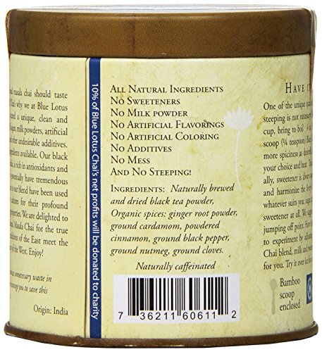 -. Binding : Misc. -. Brand : Blue Lotus Chai -. EAN : 0736211606112 -. Feature : No sweeteners; No milk powder / No artificial flavoring; No artificial coloring / No additives / No mess / And no steeping! -. Label : Blue Lotus Chai Company -. Manufacturer : Blue Lotus Chai Company -. MPN : TooFair-72J22QV -. PackageQuantity : 1 -. PartNumber : TooFair-72J22QV -. ProductGroup : Grocery -. ProductTypeName : GROCERY -. Publisher : Blue Lotus Chai Company -. Size : 3 Ounces -. Studio : Blue Lotus Chai Company -. Title : Blue Lotus Traditional Masala Chai - Makes 100 Cups! (3oz) -. UPC : 736211606112