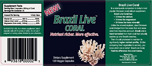 -. Binding : Health and Beauty -. Brand : Brazil Live -. EAN : 0893618000025 -. Feature : Brazil Live Coral Calcium is the only live harvested coral calcium from the untouched beaches of Brazil. / Contains more minerals than the Okinawa coral calcium. Being live harvested and cold processed, Brazil Live Coral Calcium keeps its minerals intact, giving you a superior coral calcium. / A 40 days supply. Living and Vibrant* 24 x More Trace Minerals* 3 x More Calcium and Magnesium* Cold Processed* Marine Nutrients, Proteins and Enzymes Kept In Tact* Live Harvested Brazilian Coral* / Brazil Live Coral was rated #1 by www.coralcalcium-watchdog.com, a non profit organization that analyses and rates coral calcium products. / Free Shipping when you order more than 1 bottle! ON SALE TODAY - Hurry and order while supplies last! -. Label : Brazil Live -. LegalDisclaimer : Actual product packaging and materials may contain more and different information than what is shown on our website. We recommend that you do not rely solely on the information presented and that you always read labels, warnings, and directions before using or consuming a product. Please see our full disclaimer below. -. Manufacturer : Brazil Live -. MPN : Brazil Live Coral -. PackageQuantity : 1 -. PartNumber : Brazil Live Coral -. ProductGroup : Health and Beauty -. ProductTypeName : HEALTH_PERSONAL_CARE -. Publisher : Brazil Live -. Studio : Brazil Live -. Title : Best Coral Calcium Supplement ● Cold Press Brazil Live Calcium Capsules, 40 Day Supply, Includes Magnesium and Vitamin D3 ● MAXIMUM STRENGTH FORMULA ● Buy Now, On Sale Today! -. UPC : 893618000025