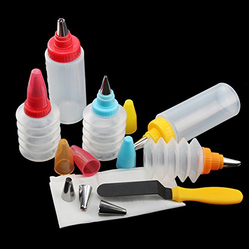 - PRODUCTS INCLUDE: This cupcake decorating set of 14, include 3 icing piping bottle kit, 2 large clear condiment squeeze, 8 cake decorating tips and 1 frosting spatula.