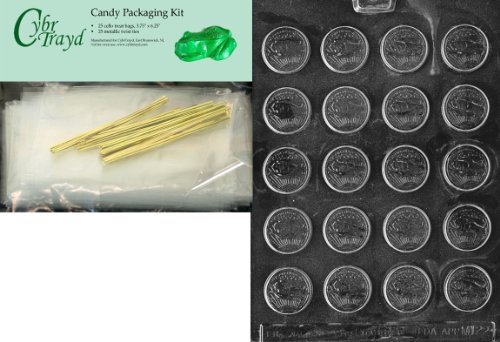 Cybrtrayd Small Coins Miscellaneous Chocolate Candy Mold with Packaging Bundle of 25 Cello Bags, 25 Gold Twist Ties and Chocolate Molding Instructions