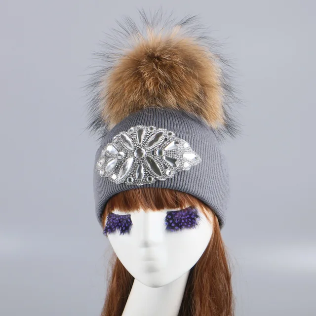 | [해외]여성 소녀 밍크 여우 볼 겨울 모자 캡 니트 크로 셰 뜨개질 두꺼운 열 울 비니 모자 화이트 블랙 큰 응원 skullies gorros |