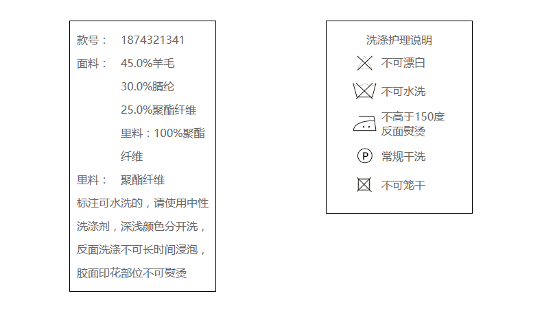 45.0%羊毛 30.0%腈纶 25.0%聚酯纤维 里料:100%聚酯纤维