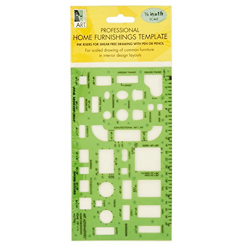 Redesigned Art Alternatives templates are made from durable and flexible 0.03" transparent green plastic with a matte finish on one side to reduce glare and ease eye strain. The professional Home Furnishings 1/8" template aids in interior design and placement of common furniture pieces. Scale is 1/8" = 1 foot, making layouts easy for home staging, pre-move planning, and rearranging prior to any heavy lifting. Centering lines provide easy alignment and the ink risers hold the template off of your surface to reduce smearing. Designed for use with a .5mm pen or pencil.Feature