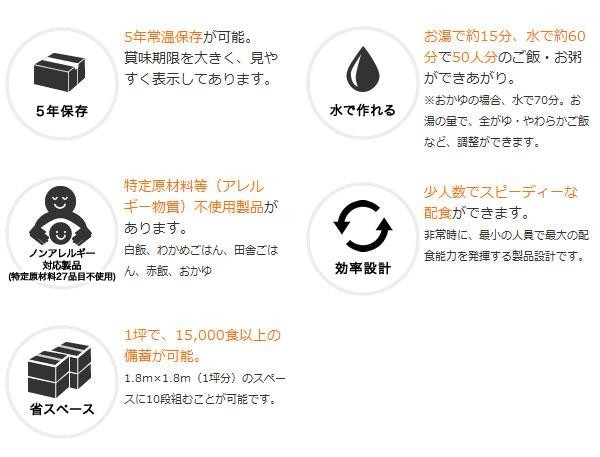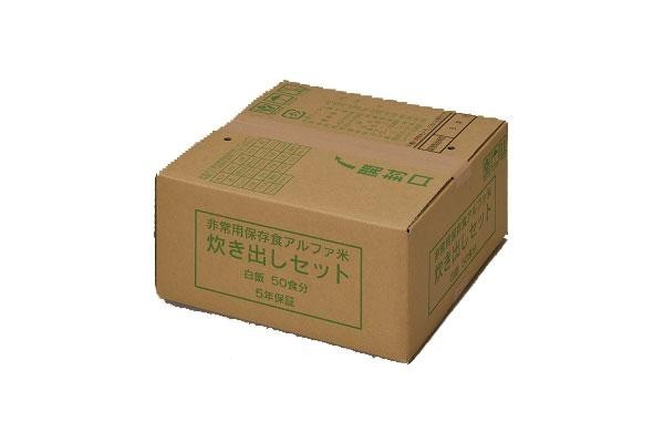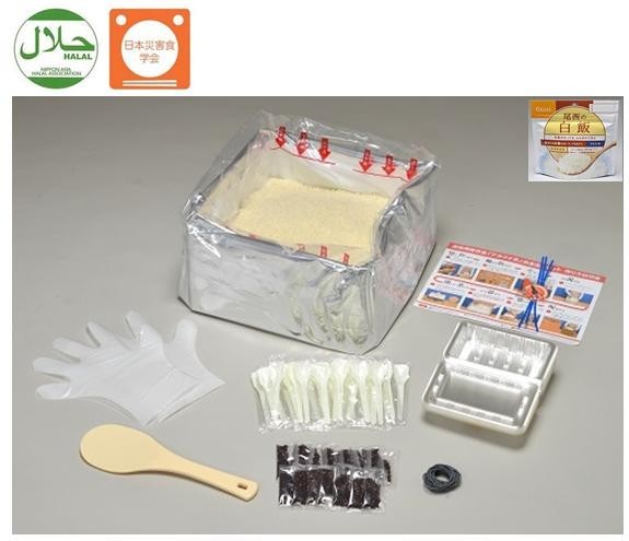 | セット内容 | アルファ米(白飯)50食分、弁当容器×50、スプーン×50、輪ゴム×50、しゃもじ×1、開封用カッター×1、衛生手袋×1、針金入りビニール紐×3、作り方説明書×1、梅しそふりかけ×50、食塩×1 |