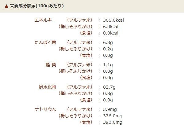| 原材料 | うるち米(国産)、梅しそふりかけ(しそ、梅肉、食塩、砂糖、かつお節)、調味料(アミノ酸等)、食塩(海塩、寒梅粉) |