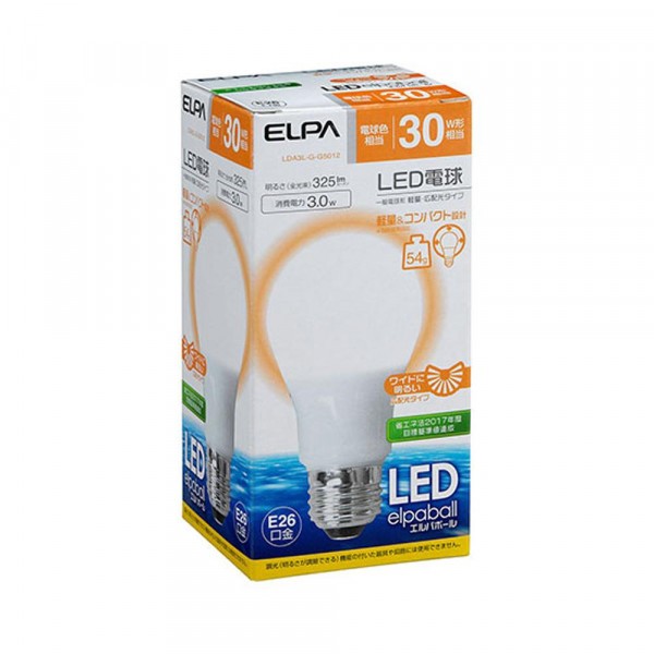 | 仕様 | ■交流電源:100V 50/60Hz共用 ■口金:E26 ■定格消費電力:3.0W ■定格入力電流:55mA ■設計寿命:40000h ■全光束:325lm ■光色:電球色相当 ■屋内用 |