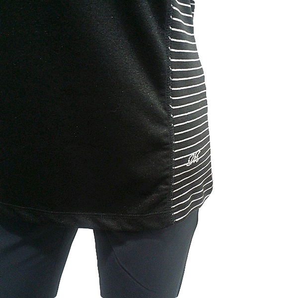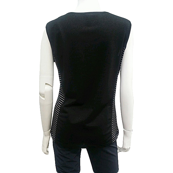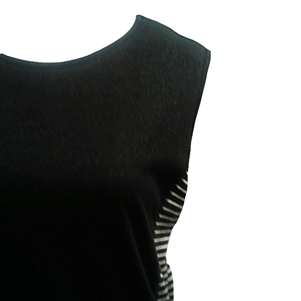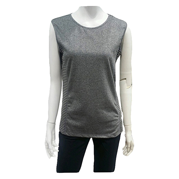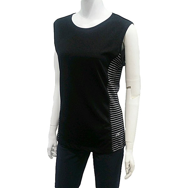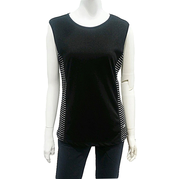 메탈 소재에 스트라이프 소재를 배색으로 사용한 민소매 라운드 티셔츠
