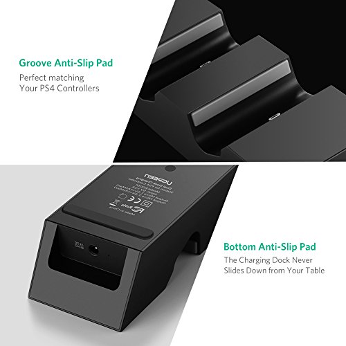 Portable and Compact Design: with 245mm x 70mm x 43mm compact size, and rubber strip under the bottom of the stand and two charge ports preventing the controller stand from scratches and sliding, it is a ideal charger and stand for your ps4 wireless controllers at home or travel;