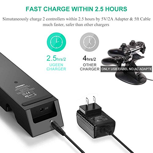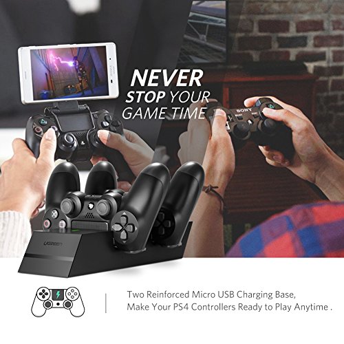 Built-in 2 Micro USB Ports: UGREEN Dual Dock Charging Station for PS4 Controller allows you to securely store and charge up two PS4 wireless controllers simultaneously without having to connect them to the PS4 system.(NOTE: 1. Do not fit for PS 4 Controller with case. 2. Only charger no PS4 controller)