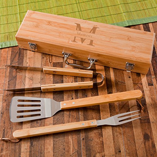 Monogrammed Grilling BBQ Set with Bamboo Case - Personalized Grilling Tool Set