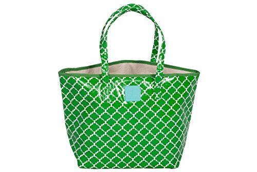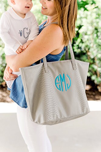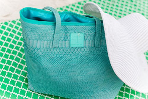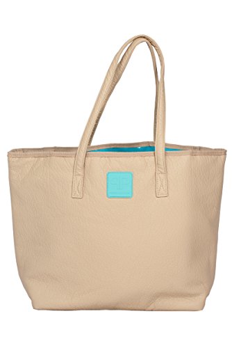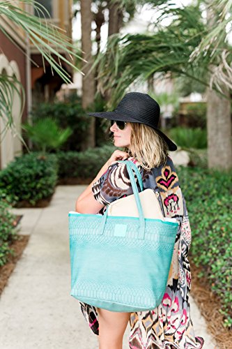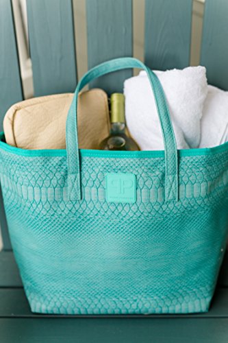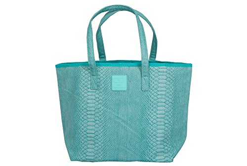Spill proof, multi-use tote bag made of faux leather. Sleek and chic alternative to traditional diaper bags. Stylish overnight bag for toddlers and tweens. Spacious interior with ample room for baby, kid and mommy gear. Turquoise liner. Interior zipper pocket. Sturdy straps for easy carrying. Wipeable inside and out.