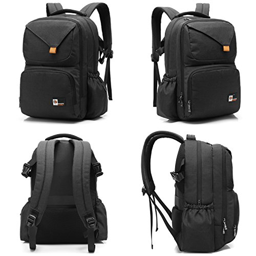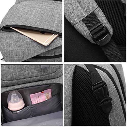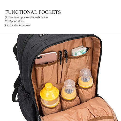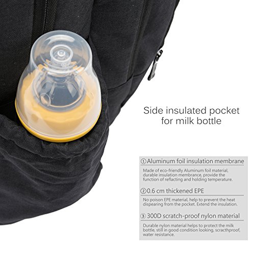 2. Varies Functional pockets. Include wipes pocket in front, 3 insulated milk bottle pockets, 2 spoon slots, 1 nipple zipped pocket on top, a roomy main compartment for keep baby's diapers, clothes, milk powder cans, shoes, blanket, and a 15.6 inch laptop etc.
