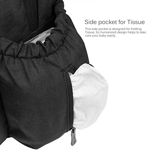 Varies functional pockets. Include 1 side tissue pocket, 1 side bottle Pocket. One front pocket for wipes. In the front compartment, include 3 insulated Milk bottle pockets, spoon slots;The main compartment for baby¡¯s clothes, shoes, milk powder, diaper etc.