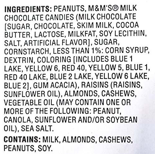 - Mix includes peanuts, M&M’s, raisins, almonds, cashews