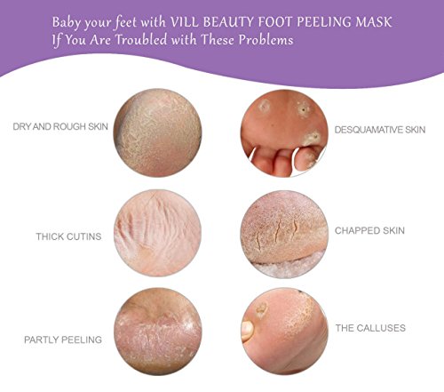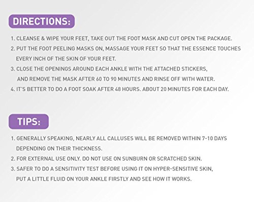 Vill BEAUTY?2 Pairs Soft Touch Foot Peel Mask Exfolianting | Dead Skin Calluses Remover, Get Soft foot ? HOW TO USE: Step 1:?Wash your feet with clean water Step 2:?Wear the foot peeling mask for an hour or an hour and a half. Strongly recommend to wear sleeping socks or thick socks over it for better effects Step 3:?Wash your feet, you can apply the foot moisturizer on the feet?if you used to. Step 4:?In?a week or two, dead skin starts falling away. After all the dead skins are naturally peeled away, you can get the soft and moist feet. Peeling period may vary depending on an individual’s skin type. The period may take from 1 week to 2 weeks. TIPS: 1. It's safer to do a sensitivity test before using it on sensitive skin, put a little fluid on your ankle firstly and see how it works. For external use only, please stop using if any wounds or discomforts. 2. After 4-7 days, the horny layers will gradually start to fall off. We recommend that you soak your feet into warm water to help dead skin to exfoliate. 3. About 1-2 weeks later, the horny layers will all fall off, leaving baby-like smooth and tender feet. 4. Do not use more than once a month. Cautions: Foot peel mask is for external use only. Do not use this product, if you are pregnant or nursing. Do not apply to irritated or damaged skin. If skin irritation occurs, stop use. Keep out of reach of children. Store in a cool place. 0 |