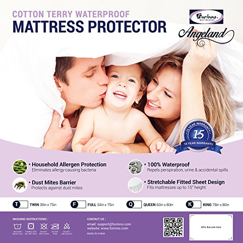 -. Feature : 100% Waterproof: Protects your mattress from urine, sweat and beverage spill. Great for families with kids, elderly, patients and pets. / Hypoallergenic: Protects mattress from dust mites, bacteria and allergens. Must-have for people with allergies, asthma, or eczema, etc. / Material: 80% soft cotton terry surface for ultimate comfort. Back coated with 100% waterproof membrane layer. Breathable, cool and noiseless. / Stretchable fitted sheet design: Fits mattress up to 15 IN height. / Machine washable: Avoid bleach and iron. Tumble dry on low heat.