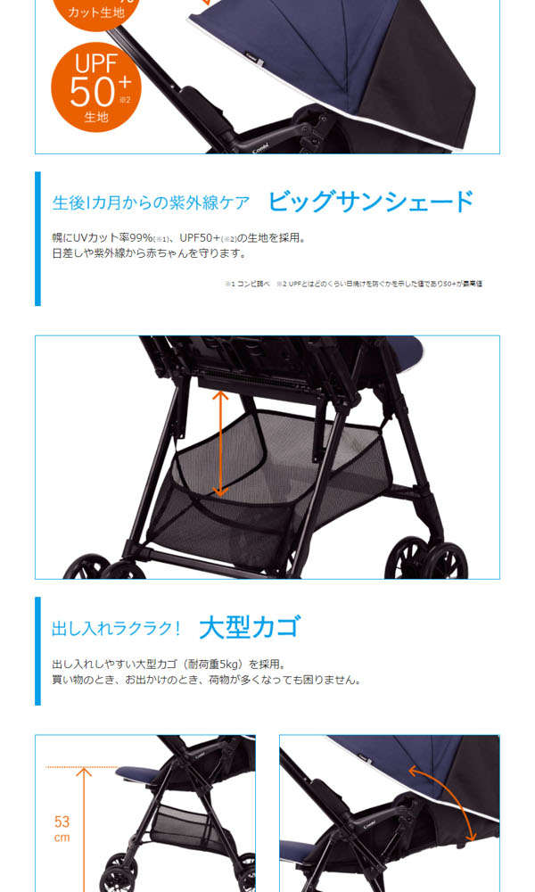 ●ビックサンシェードで幌にUVカット率99%(※1)、UPF50+(※2)の生地を採用し、日差しや紫外線から赤ちゃんを守ります。※1 コンビ調べ ※2 UPFとはどのくらい日焼けを防ぐかを示した値であり50+が最高値