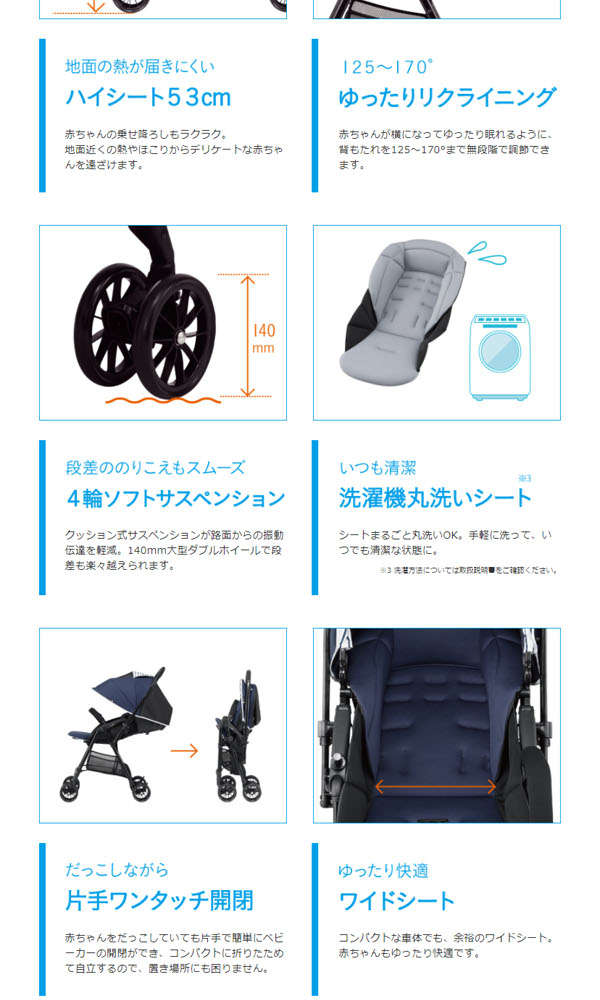 ●日差しや紫外線から赤ちゃんを守る「ビッグサンシェード」、夏の暑さやホコリから守る「ハイシート53cm」、いつも清潔な「洗濯機丸洗いシート」を搭載し、赤ちゃんの快適機能も充実しました