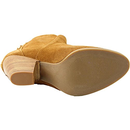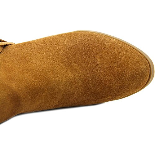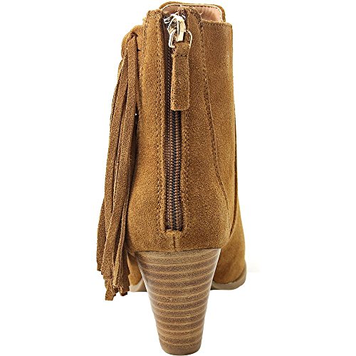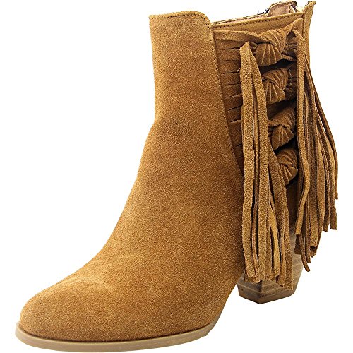 Short boot featuring almond toe and knotted fringe at outstep