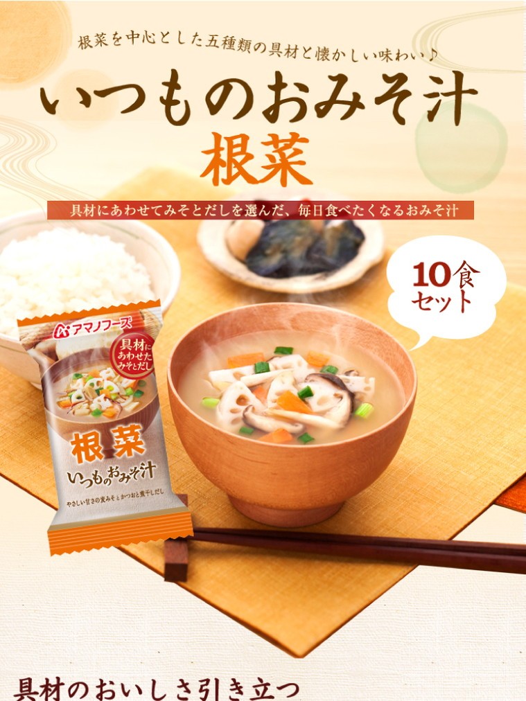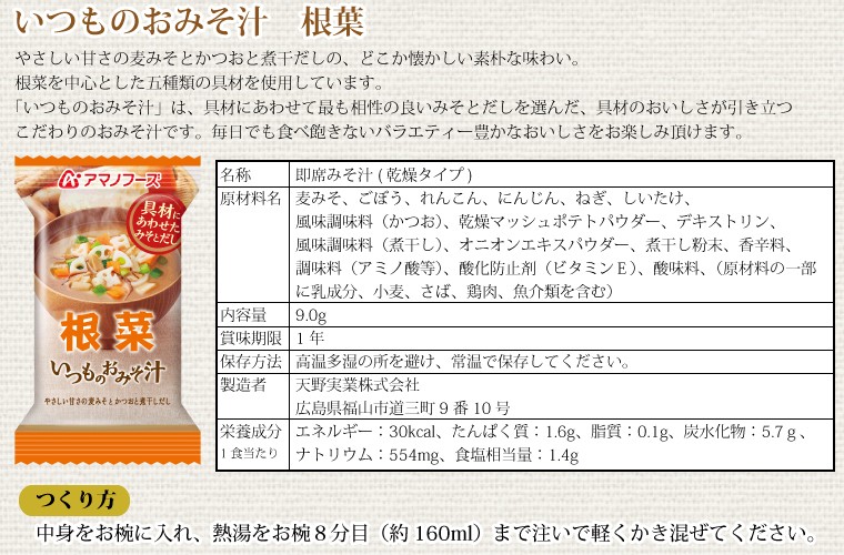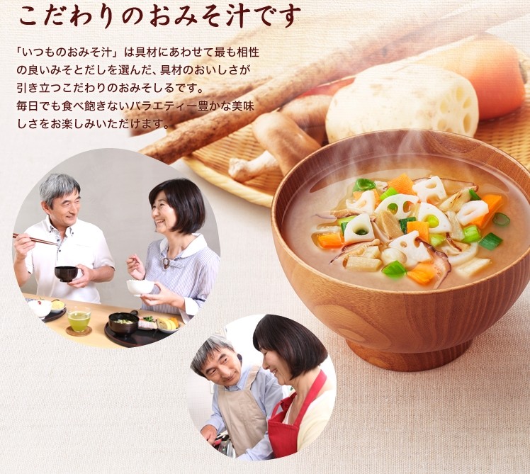 やさしい甘さの麦みそとかつおと煮干だしの、どこか懐かしい素朴な味わい。根菜を中心とした五種類の具材を使用しています。「いつものおみそ汁」は、具材にあわせて最も相性の良いみそとだしを選んだ、具材のおいしさが引き立つこだわりのおみそ汁です。毎日でも食べ飽きないバラエティー豊かなおいしさをお楽しみ頂けます。中身をお椀に入れ、熱湯をお椀8分目(約160ml)まで注いで軽くかき混ぜてください。