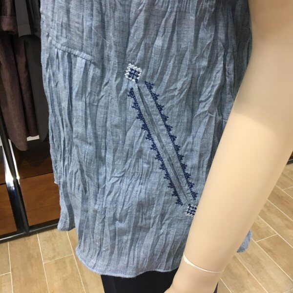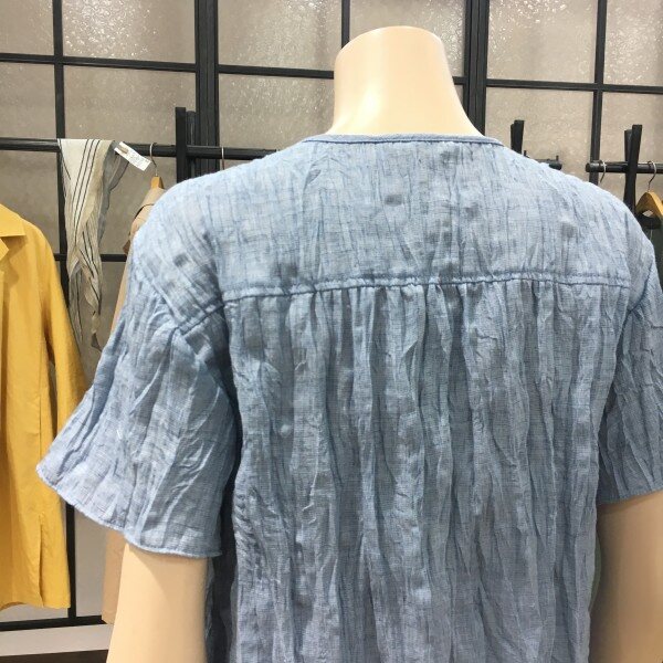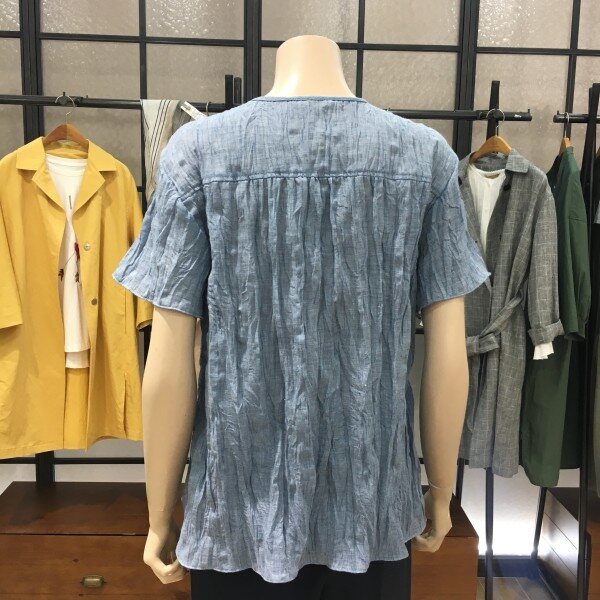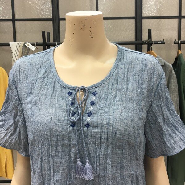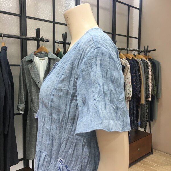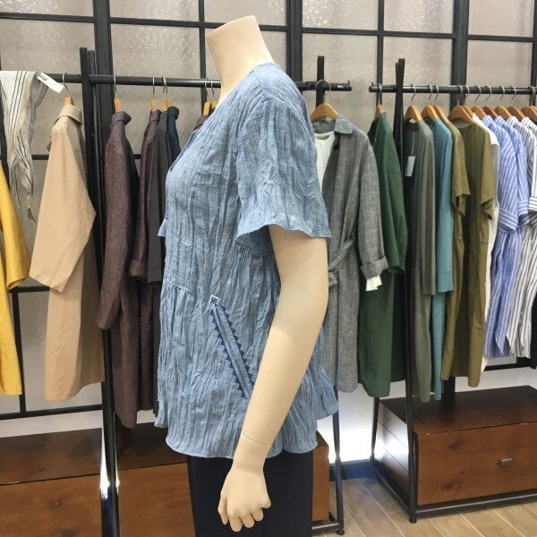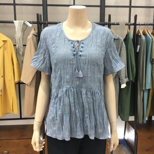 자글자글 주름이 매력적인 시원한 면혼방 소재의 블라우스 입니다 ! 자연스럽게 세로로 주름이 져서 훨씬 날씬해 보여요 ^^ 중간중간 자수 디테일이과 넥부분의 태슬 끈이 귀여운 블라우스라 깔끔한 팬츠위에 입으면 사랑스러운 느낌의 상의랍니다 ! 소매와 밑단은 살짝 프릴진 느낌이라 우아한 느낌이 드는 블라우스 ~ 총장길이는 55사이즈 기준으로 62cm 입니다.