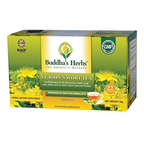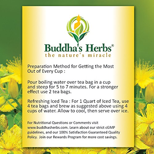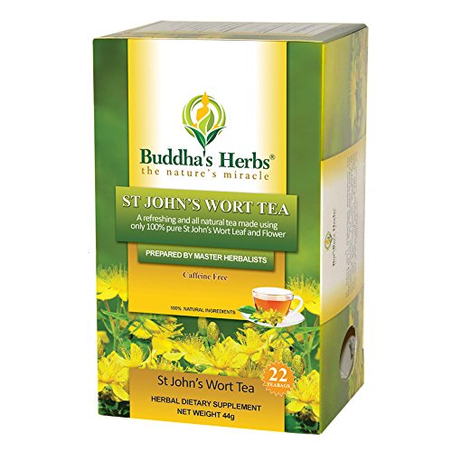 -. Binding : Grocery -. Brand : Buddha's Herbs -. Feature : St. John Wort's flower tea may support emotional health by providing natural herbs for Positive Mood Improvement / Full of tea health benefits, each box contains double Chamber Tea Bags packed in ecologically friendly filter tea bags with no glue or metal used. / This relax tea is prepared at a GMP Certified Facility and comes with 100 percent Satisfaction and Money Back Guarentee. / Full of Natural herbal benefits, St. John Wort tea is 100% pure St John Wort leaf and flower / This Herbal Tea contains no artificial flavors, ingredients or preservatives. -. Label : ?VS -. Manufacturer : ?VS -. PackageQuantity : 4 -. ProductGroup : Grocery -. ProductTypeName : GROCERY -. Publisher : ?VS -. Studio : ?VS -. Title : Buddha's Herbs Pure St John Wort's Flower Tea - 22-Count Tea Bags - Natural Herbs for Positive Mood Improvement