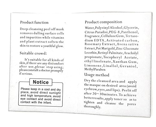 -. Feature : NO MORE POPPING AND PICKING - Our peel off mask will unclog pores and will eliminate blackheads and pimples; will draw out dirt and oil. After use, you skin will feel and look as though it can breathe better / DEEP CLEANSING - This face peel off mask acts like a magnet to draw out deep-dwelling pore-cloggers, absorbs environmental toxins and dissolves impurities / SMOOTHES SKIN TEXTURE - You deserve all the moisturizing face masks that the beauty industry has to offer. This beauty face mask can give your face proper moisture that will make your skin more alive and luster / IDEAL FOR EVERYDAY USE - This peel off mask is safe and good for daily use. It will keep your skin healthy and glowing all day / WORKS BEST FOR ALL SKIN TYPE - This impressive and effective facial care is good for everyone . It can be used all year round and suitable for all skin types. Dermatologically tested product
