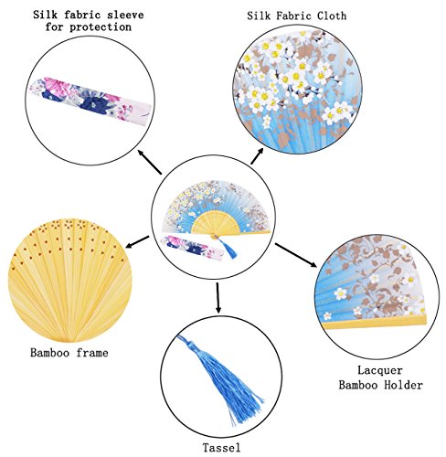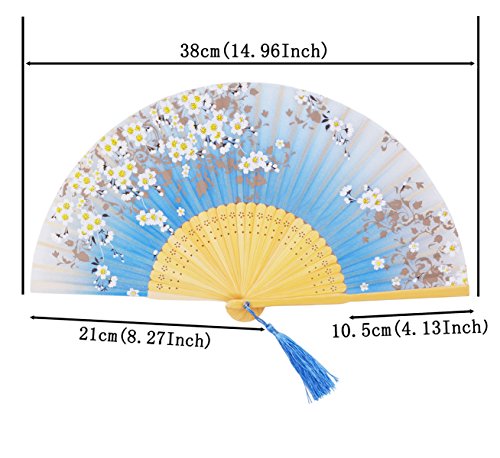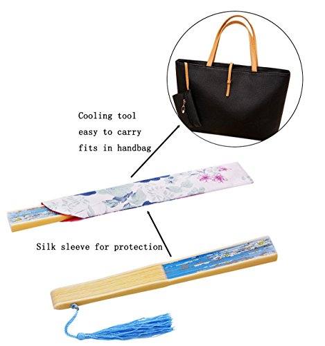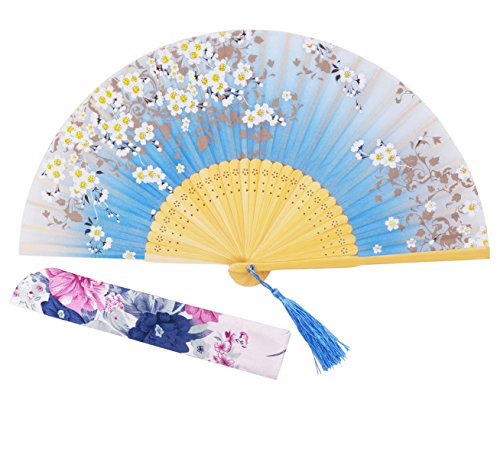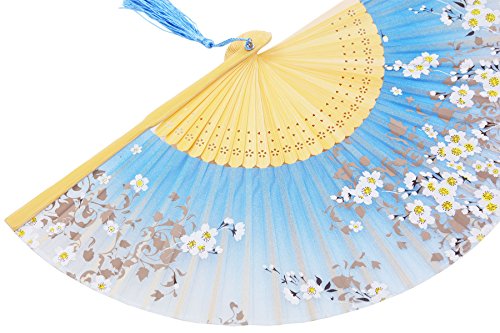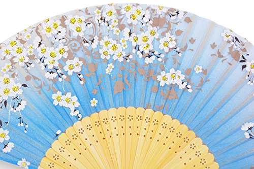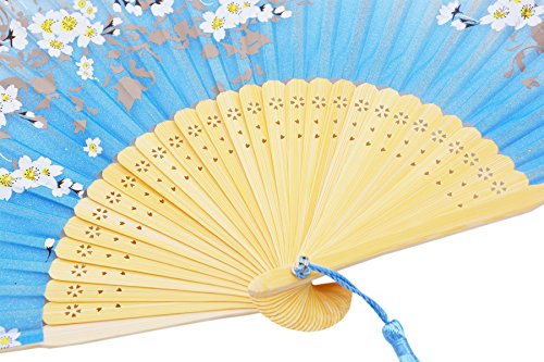 STHUAHE 8.27”(21cm) Beautiful Sakura Hand Painted Series Womans Silk Hand Help Folding Fans, Hollow Carved Bamboo Fan Frame Gift Fans Wedding Fan Dance Fan Princess Fan Craft Fan (SkyBlue)